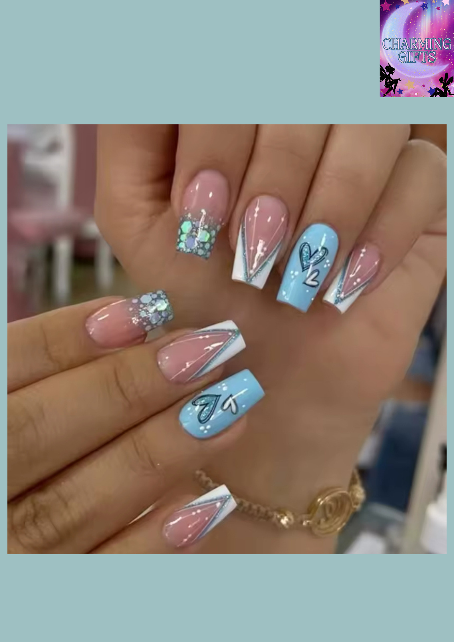 24 pcs short square French Minimalist Heart Glitter nails +1 nail glue +1 nail file