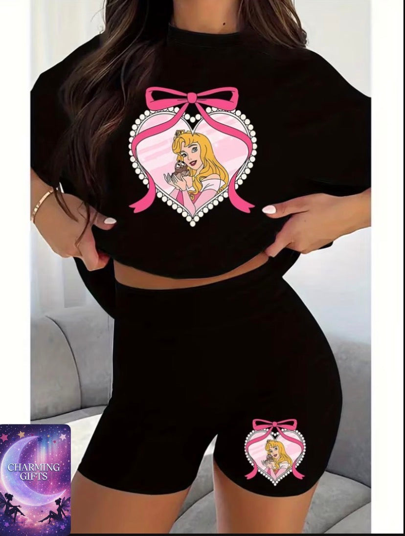 2pcs Disney-authorized Sleeping Beauty Princess Pearl Heart Frame Bow Sash Print | Casual Set with Short-Sleeve T-shirt and Shorts, Women'S Clothing