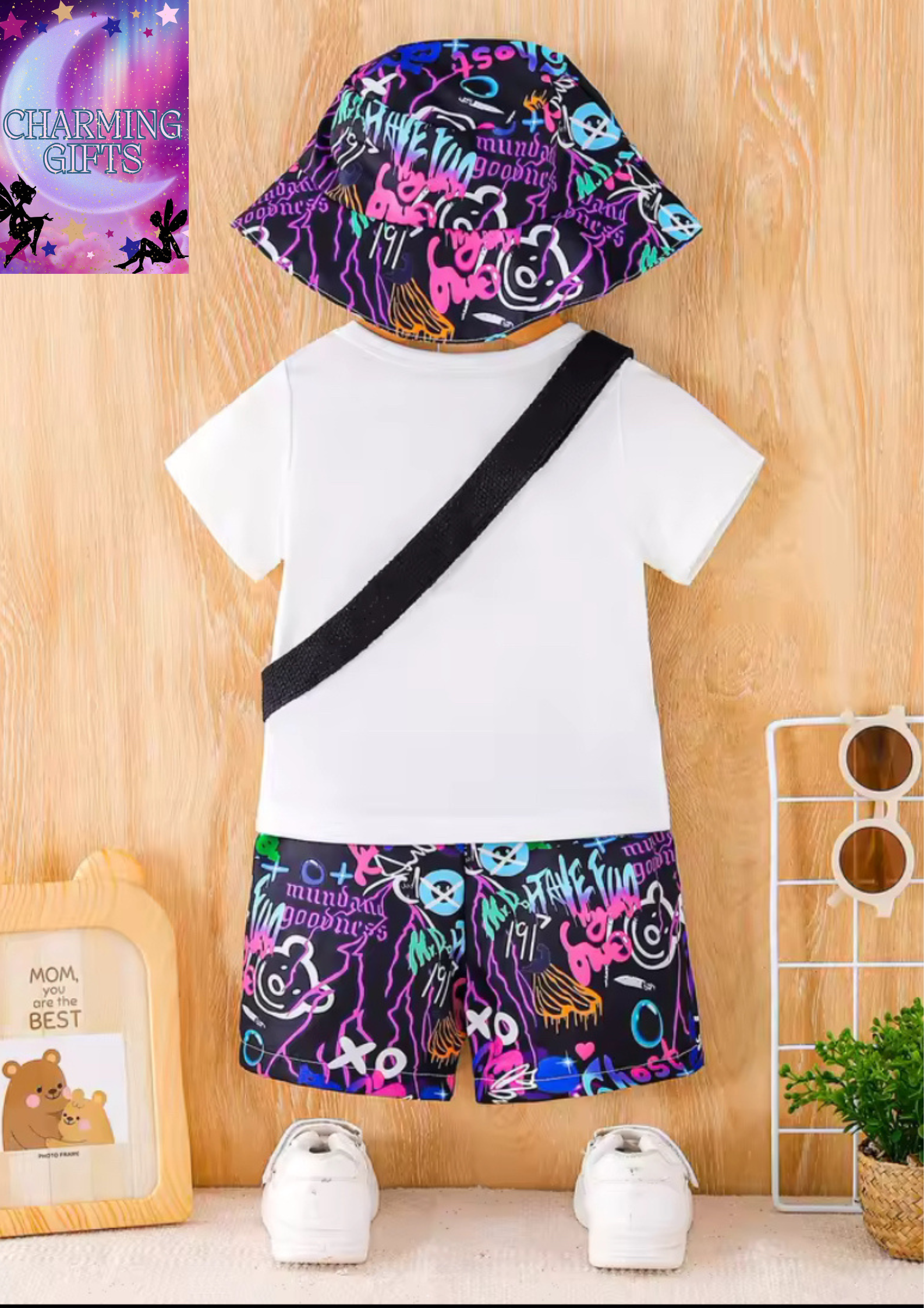 BabyBoys Summer Fashion Four-Piece Purple Letters Graffiti Fisherman Hat Bag Bottom Pants White T-Shirt Round Neck Short Sleeves