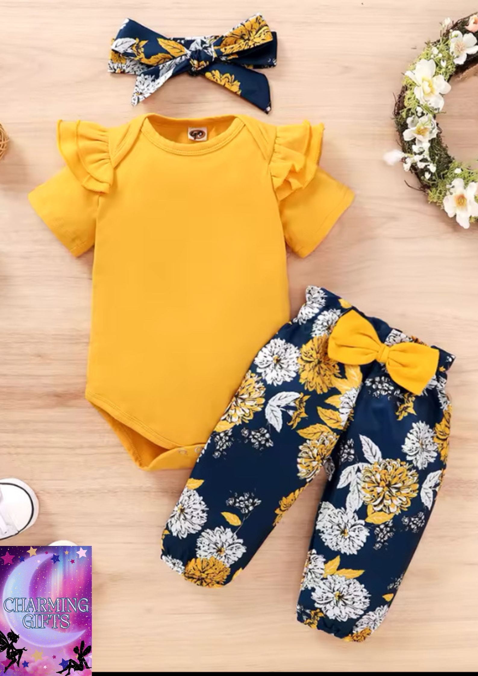 Newborn Baby Girls Clothing Set Infants Girl Short Sleeve Bodysuit+Floral Pants with Bow+Headband 3PCS Outfits for 0-18 Months